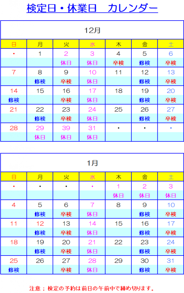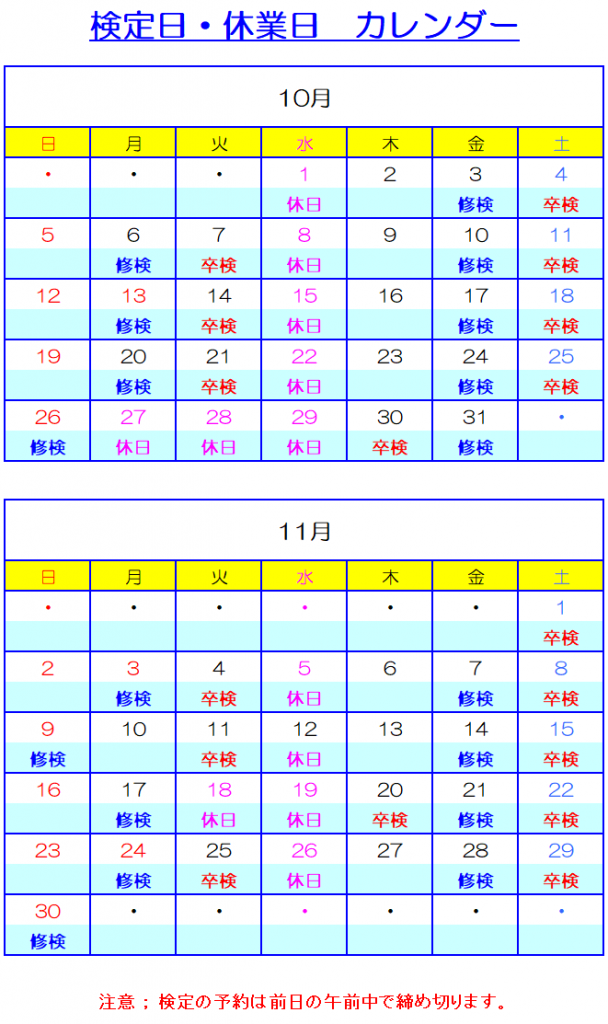 注意 : 検定の予約は前日の午前中で締め切ります。